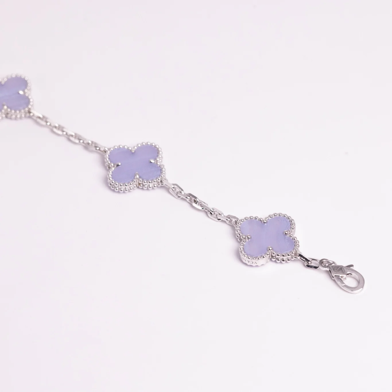 This Van Cleef & Arpels Vintage Alhambra Bracelet 5 Motifs Chalcedony 18K White Gold is made of solid 18K White Gold & Natural Chalcedony Fragment.